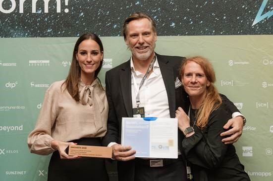 Quelle: INKOMETA Award 2025. Die Northern Fiber Holding (NFH) wurde ausgezeichnet in der Rubrik Interne Kommunikation/Mittelstandskommunikation. Von links nach rechts: Eyke Katharina Junge, Bereichsleiterin Marketing NFH, Andreas Thomsen, CCO NFH, Leonie Ballach, Unternehmenskommunikation NFH.
