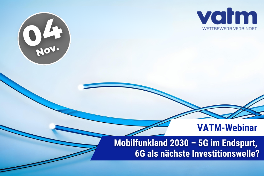Unser nächstes VATM-Webinar fokussiert sich auf den Mobilfunkausbau. Am Dienstag, den 04.11.2025, 15:00 – 16:00 Uhr, erfahren wir unter dem Titel „Mobilfunkland 2030 – 5G im Endspurt, 6G als nächste Investitionswelle?