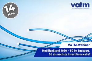 Unser nächstes VATM-Webinar fokussiert sich auf den Mobilfunkausbau. Am Dienstag, den 14.11.2025, 11:00 - 12:00 Uhr, erfahren wir unter dem Titel „Mobilfunkland 2030 – 5G im Endspurt, 6G als nächste Investitionswelle?“ wie die Zukunft des Mobilfunkausbaus nach der Analyse unseres VATM-Mitglieds BearingPoint aussieht. In deren…